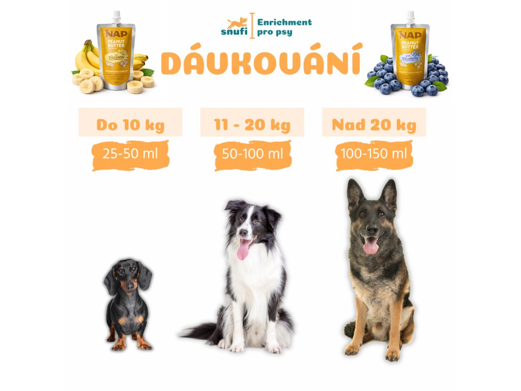 Objevte lahodné spojení NAP arašídového másla a mrazem sušených borůvek. Tato výživná pochoutka byla stvořena jako zdravá odměna po výkonu i jako pomocník pro chvíle odpočinku. Stačí nanést na lízací podložku nebo naplnit oblíbenou hračku a sledovat, jak si váš pes užívá dokonalou souhru chutí.