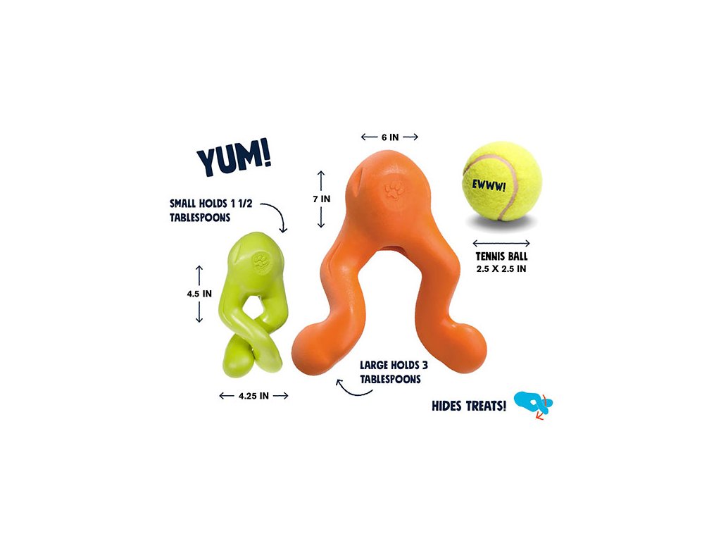Tizzi: Žabka, která skáče a neomrzí! Tato hračka je čistá akce! Tizzi je navržena tak, aby psa neustále překvapovala. Její unikátní tvar kombinuje nejlepší prvky psích hraček. Napěchujte Tizzi pamlsky, které budou při hře vypadávat, nebo ji použijte jako super raketu na házení, která se po dopadu odráží všemi směry. A když je čas na team-building, promění se v přetahovací hračku.